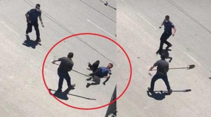 Daha sonra olay yerine gelen polise de kürekle saldıran Osman G., polis memuruna yere düşmesine rağmen vurmaya devam etti. Olay yerinden kaçan şahıs, polis ekipleri tarafından gözaltına alındı. Olay anı bir vatandaş tarafından cep telefonuyla görüntülendi.