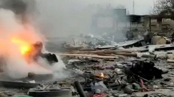 İtfaiye ekiplerinin patlama sonrası çıkan yangına müdahalesi devam ediyor.