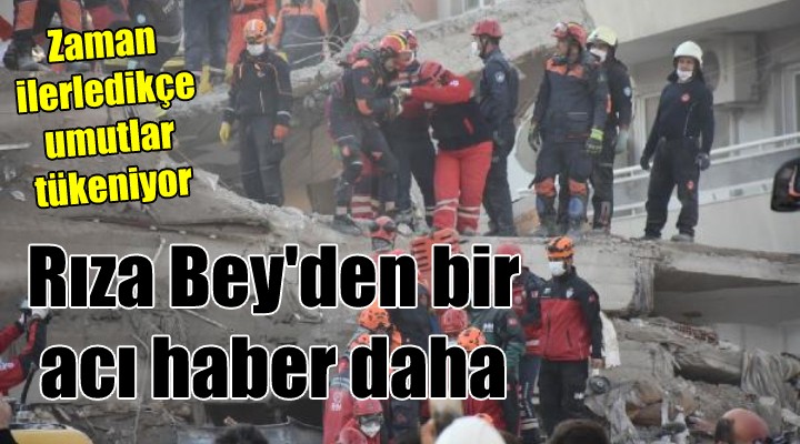 Seferihisar açıklarında önceki gün meydana gelen 6.6 büyüklüğündeki depremde 8 katlı Rıza Bey Apartmanı, yıkıldı. Apartmanın enkazında sürdürülen arama kurtarma çalışmalarında, bu sabah bir vatandaşın cansız bedenine ulaşıldı. Yapılan çalışmayla enkaz altından çıkarılan 40 yaşlarındaki erkeğin cansız bedeni, morga kaldırıldı.