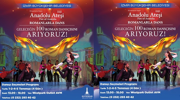 İzmir Büyükşehir Belediyesi ve Anadolu Ateşi Dans Topluluğu tarafından hayata geçirilen Romanlarla Dans projesi için seçmeler 1-2-4-5 Temmuz tarihlerinde saat 13.00-18.00 saatleri arasında yapılacak. Dansçı seçmelerinde Anadolu Ateşi’nin kurucusu ve Genel Sanat Yönetmeni Mustafa Erdoğan’da yer alacak. Seçmeleri başarıyla geçen 100 genç, projenin ilk aşamasında Anadolu Ateşi Dans Okulu’nun deneyimli koreograf ve eğitmenlerinden 31 Aralık’a kadar eğitim alacak. Eğitimin ardından dansçılar hem Roman kültürünün tanıtılacağı hem de Anadolu’nun 7 bölgesinden derlenen dans motiflerinin sergileneceği bir dans gösterisini sahneye taşımak için çalışmaya başlayacak. Projenin ikinci aşaması ise 5 ay sürecek.