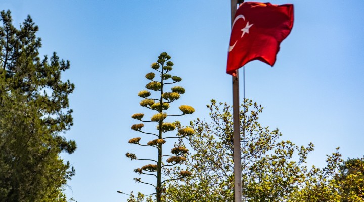 Sabır ağacı olarak bilinen ve 100 yılda bir çiçek açan Meksika kökenli Agave bitkisi, Bornova Belkahve'deki Atatürk Anı Evi'nde açtı.