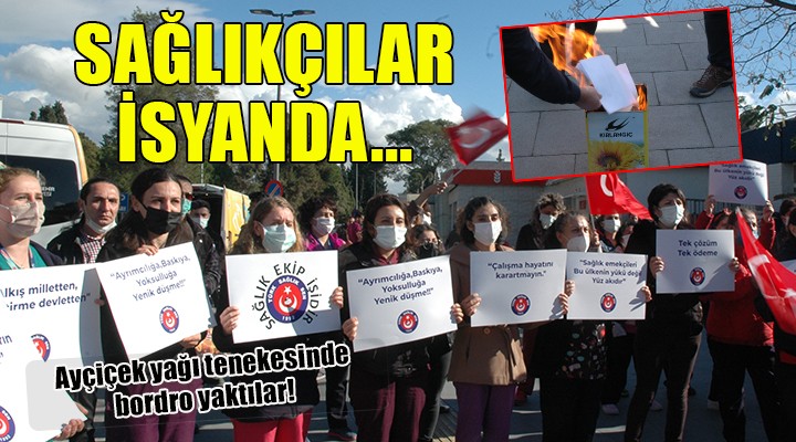 Ege Üniversitesi Hastanesi poliklinik servisi girişinde ayçiçek yağı tenekesinde bordro yakma eylemi yapıldı. Son dönemde en çok zamlanan besinlerden ayçiçek yağının boş tenekesinde bordrolarını yakan sağlık çalışanları, koronavirüsün meslek hastalığı sayılması, ek göstergelerin 3600’den başlayarak kademeli olarak 7200’e kadar tüm sağlık emekçilerine uygulanması, yıpranma paylarının verilmesi ve yaşadıkları sıkıntılara çözüm bulunması için Sağlık Bakanlığı'na çağrı yaptı.