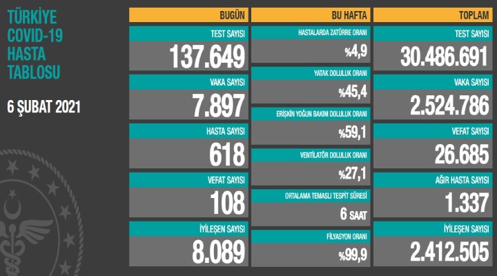 Sağlık Bakanlığı'nca duyurulan 'Türkiye Covid-19 Hasta Tablosu'na göre; son 24 saatte yapılan 137 bin 649 testte 7 bin 897 vaka, 618 hasta tespit edildi. Virüs nedeniyle 108 kişi hayatını kaybederken, 8 bin 89 kişi de iyileşti. Bugünkü verilerle toplam test sayısı 30 milyon 486 bin 691 toplam vaka sayısı 2 milyon 524 bin 786, toplam vefat sayısı 26 bin 685, toplam ağır hasta sayısı 1337, toplam iyileşen hasta sayısı 2 milyon 412 bin 505 oldu.