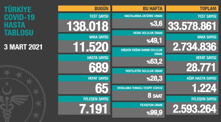 Sağlık Bakanlığı'nca duyurulan 'Türkiye Covid- 19 Hasta Tablosu'na göre; son 24 saatte yapılan 138 bin 18 testte 11 bin 520 vaka, 689 hasta tespit edildi. Virüs nedeniyle 65 kişi hayatını kaybederken, 7 bin 191 kişi de iyileşti. Bugünkü verilerle toplam test sayısı 33 milyon 578 bin 861, toplam vaka sayısı 2 milyon 734 bin 836, toplam vefat sayısı 28 bin 771, toplam ağır hasta sayısı 1224, toplam iyileşen hasta sayısı ise 2 milyon 593 bin 264 oldu.