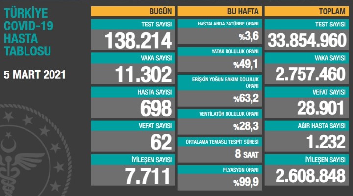 Sağlık Bakanlığı'nca duyurulan 'Türkiye Covid- 19 Hasta Tablosu'na göre; son 24 saatte yapılan 138 bin 214 testte 11 bin 302 vaka, 698 hasta tespit edildi. Virüs nedeniyle 62 kişi hayatını kaybederken, 7 bin 711 kişi de iyileşti. Bugünkü verilerle toplam test sayısı 33 milyon 854 bin 960, toplam vaka sayısı 2 milyon 757 bin 460, toplam vefat sayısı 28 bin 901, toplam ağır hasta sayısı 1232, toplam iyileşen hasta sayısı ise 2 milyon 608 bin 848 oldu.