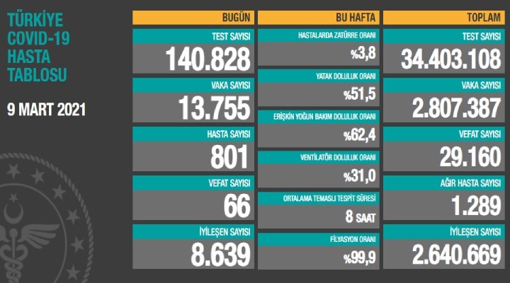 Sağlık Bakanlığı'nca duyurulan 'Türkiye Covid-19 Hasta Tablosu'na göre; son 24 saatte yapılan 140 bin 828 testte 13 bin 755 vaka, 801 hasta tespit edildi. Virüs nedeniyle 66 kişi hayatını kaybederken, 8 bin 639 kişi de iyileşti. Bugünkü verilerle toplam test sayısı 34 milyon 403 bin 108, toplam vaka sayısı 2 milyon 807 bin 387, toplam vefat sayısı 29 bin 160, toplam ağır hasta sayısı 1289, toplam iyileşen hasta sayısı ise 2 milyon 640 bin 669 oldu.