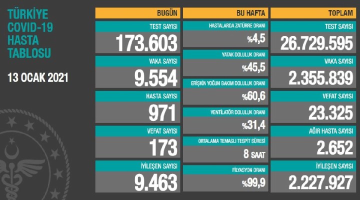 Sağlık Bakanı Fahrettin Koca, salgın nedeniyle yaşanan yeni can kaybını, vaka ve hasta sayısını açıkladı. Tabloya göre son 24 saatte 173 kişi corona virüsünden hayatını kaybetti, toplam can kaybı 23 bin 325’e yükseldi. Bugün toplam 173 bin 603 test yapıldı. Semptom gösteren 971 kişiyle birlikte toplam 9 bin 554 yeni vaka tespit edildi. Türkiye’de toplam vaka sayısı 2 milyon 355 bin 839 oldu. Bugün iyileşen 9 bin 463 kişiyle birlikte toplam iyileşen hasta sayısı 2 milyon 227 bin 927’e yükseldi. Toplam hastalarda zatürre oranının yüzde 4.5, toplam ağır hasta sayısının ise 2 bin 652 olduğu açıklandı. Türkiye genelinde yatak doluluk oranı yüzde 45.5, erişkin yoğun bakım doluluk oranı yüzde 60.6 ve ventilatör doluluk oranı yüzde 31.4 olarak duyuruldu.