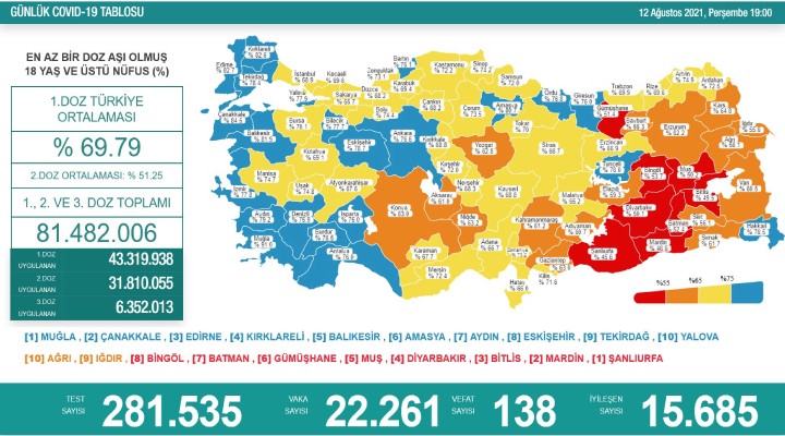 En az bir doz aşı olmuş 18 yaş ve üzeri nüfus verilerinde 1'inci doz Türkiye ortalaması yüzde 69,79, 2'nci doz ortalaması yüzde 51,25 olarak ölçüldü. Ayrıca, 1'inci dozda 43 milyon 319 bin 938, 2'nci dozda 31 milyon 810 bin 55 ve 3'üncü dozda 6 milyon 352 bin 13 olmak üzere toplam 81 milyon 482 bin 6 aşı uygulandı.