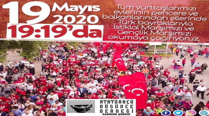 19 Mayıs 2020 tarihinde Samsun’da ’Çıt Bile Çıkmasın’ isteyenlere cevabımızı Saat:19.19 Evlerimizin balkonlarından, Camlarından elimizde Bayraklarımızla İstiklal Marşımızı ve Gençlik Marşımızı okuyarak Samsun’u inleterek vereceğiz.