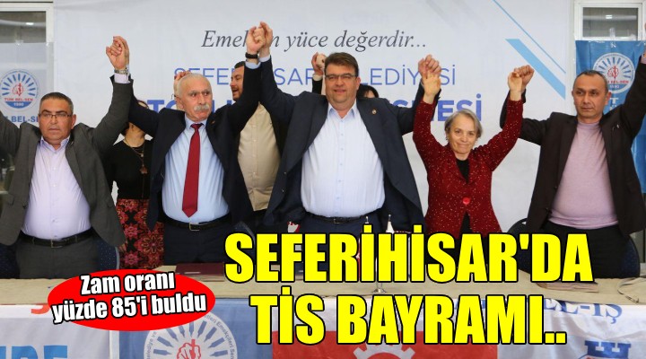 Seferihisar Belediyesi’nde emekçi bayramı vardı. Belediye yönetimi, tüm çalışanlarına toplamda %85’e varan oranlarda zam yaptı. Seferihisar Belediyesi Düğün Salonu’nda düzenlenen Toplu İş Sözleşmesi imza törenine Seferihisar Belediye Başkanı İsmail Yetişkin, Belediye Başkan Yardımcısı Nuriye Hepterlikçi, CHP Seferihisar İlçe Başkanı Rahmi Tezel Çınar, DİSK Ege Bölge Temsilcisi Memiş Sarı, Tüm-Bel Sen İzmir 1 Nolu Şube Başkanı Cevdet Keleş, Belediye İş İzmir 2 Nolu Şube Başkan Yardımcı Turan Dündar, Seferihisar Belediyesi Meclis Üyesi adayları ile belediye personelleri katıldı.