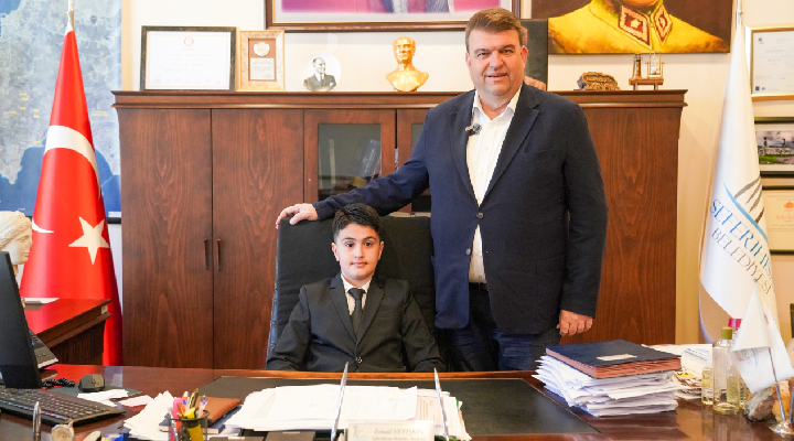 Belediye binasında gerçekleşen anlamlı törende Başkan İsmail Yetişkin, Ahmet Eymen Şanlı’yı makamında ağırlayarak koltuğunu devretti. Küçük başkan Ahmet Eymen Şanlı, duygu ve düşüncelerini paylaşırken çocuklara yönelik projelerle ilgili fikirlerini dile getirdi.