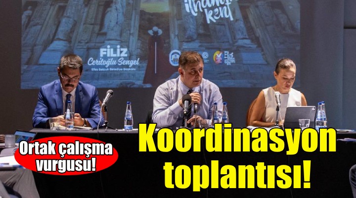 İzmir Büyükşehir Belediye Başkanı Dr. Cemil Tugay, ilçelerin sorunlarını yerinde belirlemek ve çözümleri hızlı bir şekilde hayata geçirmek için başlattığı koordinasyon toplantılarına Selçuk'ta devam etti. İzmir'in turistik ilçelerinden Selçuk'ta, Belediye Başkanı Filiz Ceritoğlu Sengel ev sahipliğinde düzenlenen koordinasyon toplantısında, İzmir Büyükşehir Belediye Başkanı Dr. Cemil Tugay ile İzmir Büyükşehir Belediyesi Genel Sekreteri Barış Karcı, İzmir Büyükşehir Belediyesi Genel Sekreter Yardımcıları Şükran Nurlu, Ertuğrul Tugay, Zeki Yıldırım, Çağatay Güç, ESHOT Genel Müdürü Turgay Bozoğlu, İZSU Genel Müdürü Gürkan Erdoğan, İzmir Planlama Ajansı Başkanı Koray Velibeyoğlu ve Selçuk Belediyesi’nin bürokratları yer aldı.