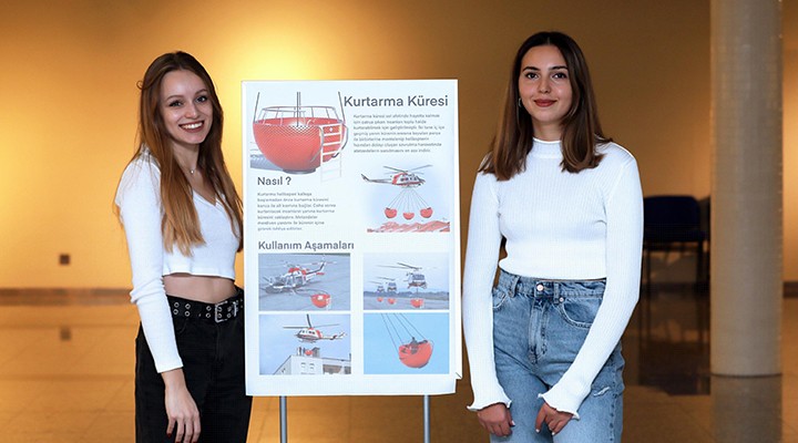 Elifnur Akdolan ve Zeynep Gönülalan, Endüstriyel Tasarım Bölümü Dr. Öğretim Görevlisi Ezgi Ozan Avcı'nın yürüttüğü Tasarım Yarışması Projeleri dersi kapsamında tasarladıkları ve kendilerine birincilik getiren projeyi anlattı. Öğrenciler, Kastamonu Bozkurt'taki sel felaketinde çatıda tek tek kurtarılmayı bekleyen aileyi televizyonda izledikten sonra böyle bir tasarım yapmaya karar verdiklerini belirterek, "Sel olduğu zamanlarda insanların evini su basınca genelde herkes evin çatısına kaçıyor. Bunun örneklerini son zamanlarda yaşanan sel baskınlarında da gördük. İnsanlar gruplar halinde çatılarda mahsur kalıyor ve kurtarma için helikopterler geliyor. Bu helikopterlerden profesyonel bir kişi aşağıya halatla iniyor ve sadece bir kişiyi kendine bağlayıp helikoptere çıkartabiliyor. Uzun bir sürede, sadece tek bir kişiyi kurtarılabiliyor. Bu süreyi kısaltacak ve bir seferde daha fazla insanın kurtarılmasını sağlayacak bir tasarım yapmak istedik. Tasarladığımız kurtarma küresi sayesinde, insanları gruplar halinde aynı anda kurtarmak ve sarsmadan taşıyabilmek mümkün olabilecek" dedi.