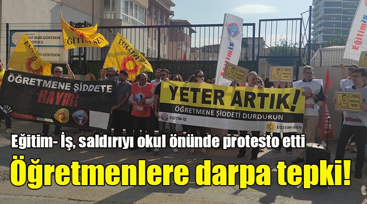 SONKALEİZMİR- Eğitim- İş İzmir 2 No'lu ve 4 No'lu şube üyeleri, öğretmenlerin saldırıya uğradığı Reşat Nuri Güntekin Ortaokulu önüne giderek ortak bir basın açıklaması yaptı. "Yeter Artık Öğretmene Şiddeti Durdurun" yazılı pankart taşınan protestoda açıklamayı Eğitim İş İzmir 2 No'lu Şube Başkanı Ahmet Cangı okudu.