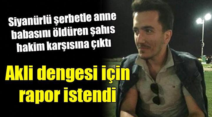 Bayraklı'da annesi Fatma (39) ve babası Mehmet Kalkan'ı (46), siyanürlü şerbeti içirerek öldüren Mahmut Can Kalkan (21), hakim karşısına çıktı. Psikolojik sorunları olduğunu ileri süren sanık, "Sevgilimden ayrıldıktan sonra kırmızı gözlü biriyle tanıştım. Onu sadece ben görebiliyorum. O bana siyanürle ailemi ortadan kaldırmamı söyledi. O şu an cezaevinde beni bekliyor" dedi. Mahkeme, sanığın cezai ehliyetinin olup olmadığının belirlenmesi amacıyla rapor alınmasına karar vererek duruşmayı erteledi.