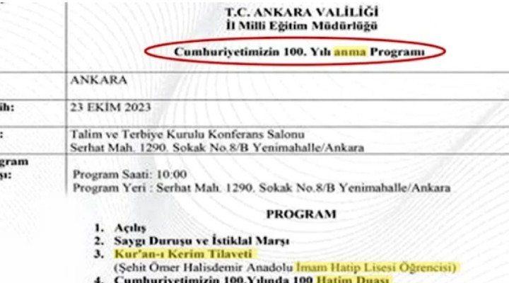 Ankara Valiliği İl Milli Eğitim Müdürlüğü, Cumhuriyetin 100. yılı için çeşitli anma programları düzenledi. Talim Terbiye Kurulu'nun konferans salonunda 23 Ekim günü düzenlenecek etkinlikte, Kuran-ı Kerim tilaveti ve 100 hatim duası yapılacak. Şehit Ömer Halisdemir İmam Hatip Lisesi öğrencileri Türkiye Yüzyılı temalı oratoryo seslendirecek. Sinevizyon gösterisi ve “Geçmişin Mirasına Sahip Çıkarak Geleceğe Hazırlanan Nesiller” isimli musiki konseri de yine imam hatip öğrencileri tarafından sunulacak. Programda, imam hatip öğrencilerinin ‘100. Yıl ve Türkiye Yüzyılı' temalı sergisi de yer alıyor. Etkinlik boyu imam hatip öğrencileri sunum yapacak ancak yemek ikramlarını ise teknik lise öğrencileri hazırlayıp sunacak.