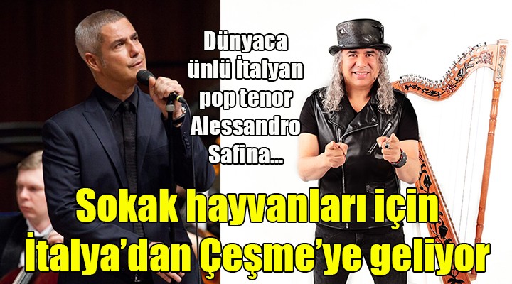 Sosyal sorumluluk projeleri dikkat çeken Çeşme Belediyesi’nin katkılarıyla Çeşme Alaçatı Doğa ve Hayvanseverler Derneği(ÇESAL) tarafından sahipsiz hayvanlar yararına gerçekleştirilen konserde Alessandro Safina ve Arkadaşları, İzmir Filarmoni Orkestrası eşliğinde sahne alacak. Çeşme Açıkhava Tiyatrosu’nda 11 Ağustos Pazar saat 21.00’de yapılacak konser gelirinin tamamı Çeşme’deki sahipsiz hayvanlara aktarılacak.