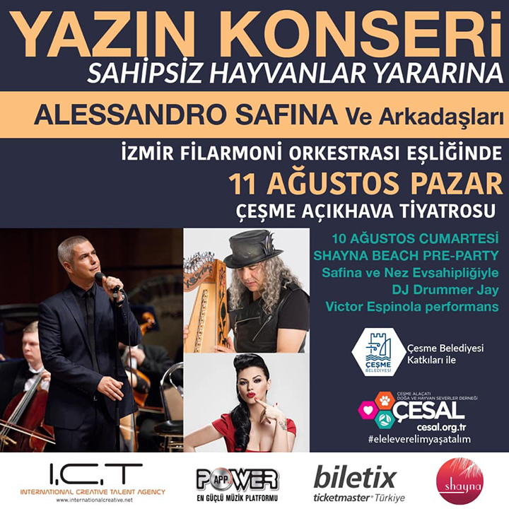 Sosyal sorumluluk projeleri dikkat çeken Çeşme Belediyesi’nin katkılarıyla Çeşme Alaçatı Doğa ve Hayvanseverler Derneği(ÇESAL) tarafından sahipsiz hayvanlar yararına gerçekleştirilen konserde Alessandro Safina ve Arkadaşları, İzmir Filarmoni Orkestrası eşliğinde sahne alacak. Çeşme Açıkhava Tiyatrosu’nda 11 Ağustos Pazar saat 21.00’de yapılacak konser gelirinin tamamı Çeşme’deki sahipsiz hayvanlara aktarılacak.