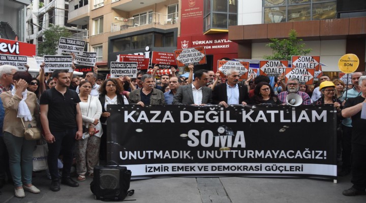 İzmir Emek ve Demokrasi Güçleri üyesi yaklaşık 100 kişi, Alsancak semtindeki Kıbrıs Şehitleri Caddesi'ndeki Türkan Saylan Kültür Merkezi önünde toplanarak, Soma'daki kömür ocağında 301 madencinin hayatını kaybettiği olayın 5'inci yıldönümü nedeniyle eylem yaptı. Ellerinde, 'Soma'nın hesabı sorulacak', 'İş cinayetlerine son' pankartları tutan grup adına basın açıklamasını okuyan Lütfi Çamlı, "Soma'nın üzerinden geçen 5 yıl boyunca, acılarımızın hafiflemesi bir yana, yaraları daha da kanatan gelişmeler oldu. İşçinin, emeğinin olduğu kadar yaşamının da ucuz olduğu bu düzende, insanlık bir kez daha göçük altında kalmış oldu." dedi.