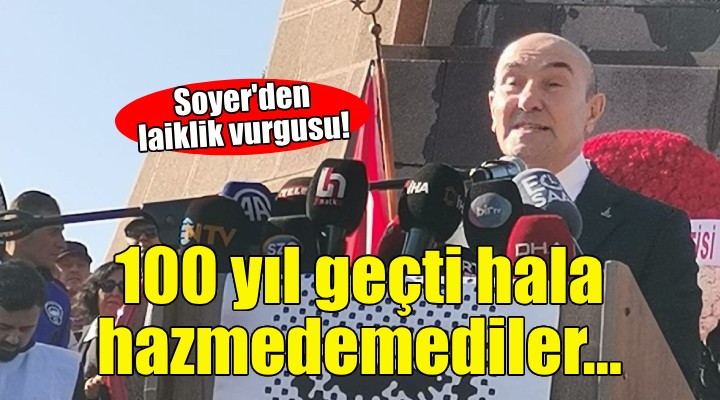 Bugün burada Cumhuriyet’in devrimlerini hazmedemeyen halk düşmanlarına karşı, Cumhuriyetimizin 100'üncü yılında o devrimleri ölümsüzleştireceğimize bir kere daha ant içiyoruz. 93 yıl önce bugün, Cumhuriyet Şehitlerimiz, bir avuç korkak karşısında nasıl dimdik durduysa... Biz de bu karanlığın karşısında öyle dimdik duruyoruz! Özgürlüğümüze, demokrasiye, barışa ve adalete zarar vermeye çalışanlara asla geçit vermeyeceğiz Okullarımızı tarikatlara açmaya çalışan karanlık zihniyete asla izin vermeyeceğiz. Biz Mustafa Kemal’in İzmir’iyiz! Cumhuriyet devrimlerinin ebedi bekçileriyiz. Şimdi sıra bizde. Daima demokrasi! Daima laiklik! Daima Cumhuriyet!''