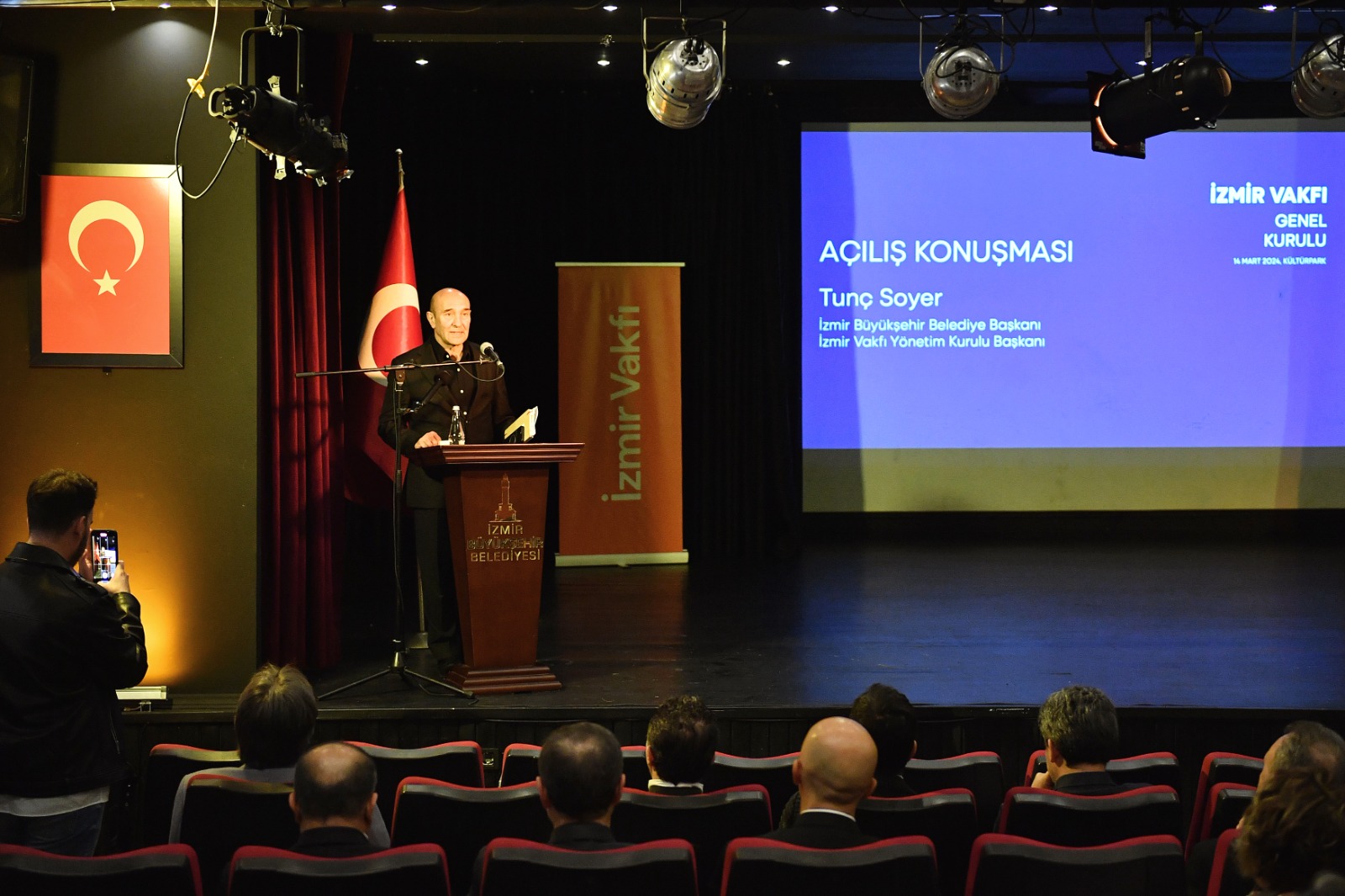 İzmir Büyükşehir Belediye Başkanı Tunç Soyer, İzmir Vakfı’nın 2024 Yılı Genel Kurulu’na katıldı. Kültürpark’taki Gençlik Tiyatrosu’nda düzenlenen Genel Kurul’un açılış konuşmasını İzmir Vakfı Başkanı Tunç Soyer yaptı.
