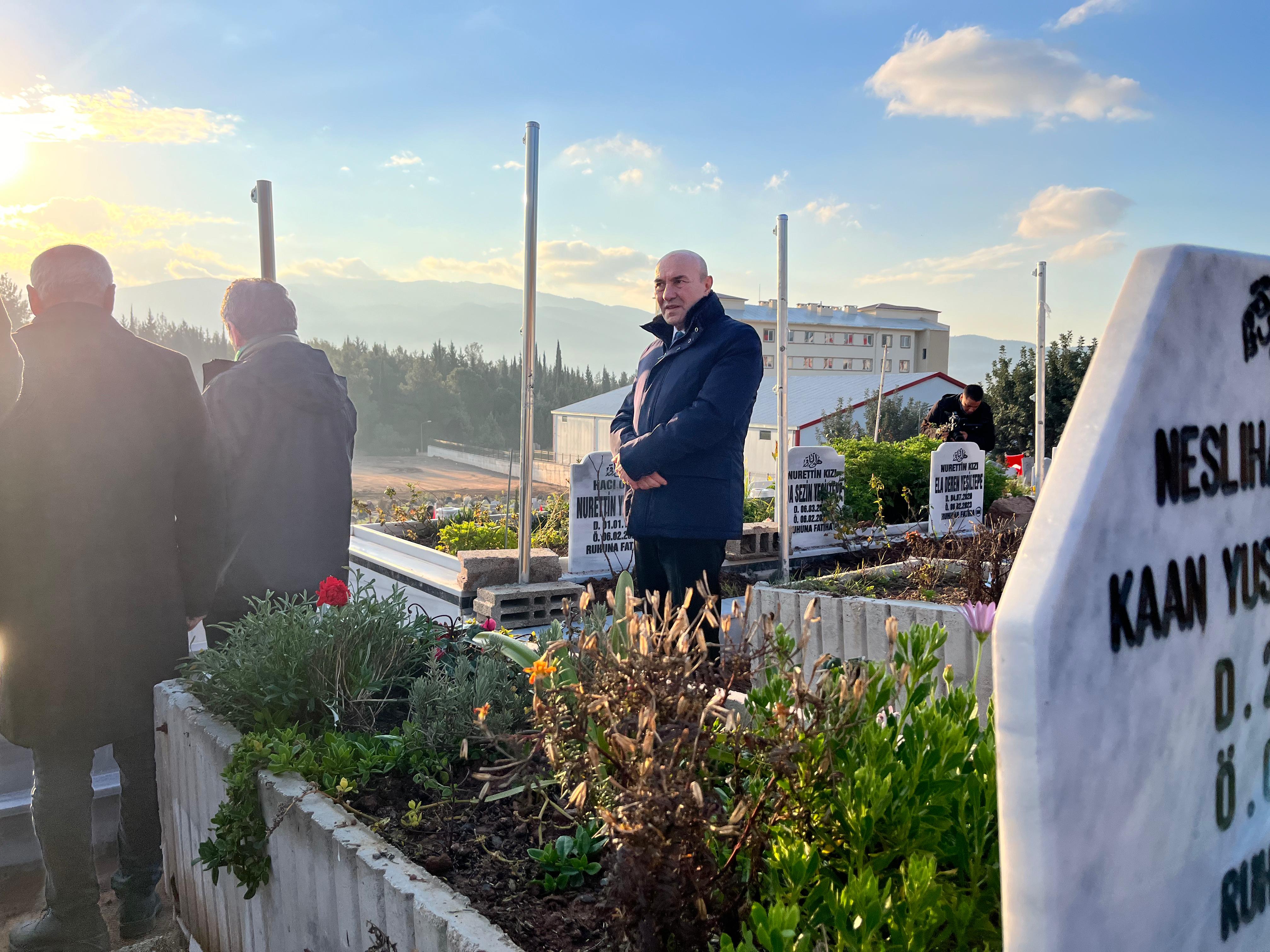 Kahramanmaraş merkezli 6 Şubat depremlerinin birinci yıldönümünde afet bölgesine giden İzmir Büyükşehir Belediye Başkanı Tunç Soyer, Osmaniye'de depremzedelerle buluşmaya devam ediyor. Sabah 04.17'de Osmaniye'de yapılan anma töreni sonrası depremde hayatını kaybeden yurttaşların defnedildiği Osmaniye Şehir Mezarlığı'nı ziyaret eden Başkan Tunç Soyer, kabirlere karanfil bıraktı ve depremde yakınlarını kaybeden ailelere başsağlığı diledi.