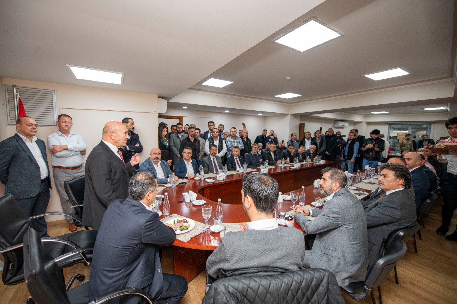 İzmir Büyükşehir Belediye Başkanı Tunç Soyer, İzmir Büyükşehir Belediyesi’nin birçok biriminde örgütlü Türkiye İşçi Sendikaları Konfederasyonu’na (TÜRK-İŞ) bağlı Belediye İş Sendikası İzmir Şubesi’nin üyeleriyle bir araya geldi. Belediye İş Sendikası’ndaki buluşmada yüzlerce işçi Başkan Soyer’i “Asla yalnız değilsin”, “İzmir Tunç’tur, Tunç kalacak” sloganları ile karşıladı. Belediye İş Sendikası’nın İzmir şubelerinde örgütlü işçiler 9 Eylül’ün 100’üncü yılı kutlamalarında Atatürk’ün Nutuk kitabından alıntı yaptığı için hakkında soruşturma başlatılan İzmir Büyükşehir Belediye Başkanı Tunç Soyer’e geçtiğimiz hafta Egemenlik Evi önünde toplanarak destek vermişti.