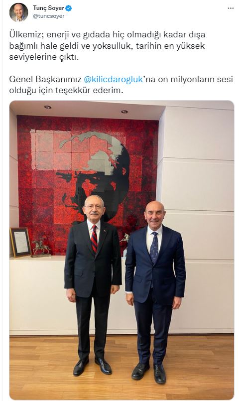 SONKALEİZMİR-Başkan Soyer sosyal medya hesabından yaptığı açıklama ile CHP Genel Başkanı Kemal Kılıçdaroğlu'na destek verdi. Soyer şu paylaşımı yaptı: