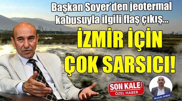 Mustafa AKBAŞ/SONKALEİZMİR (ÖZEL)- İzmir Valiliği'nin Çeşme’den, Seferihisar, Bayındır, Foça ve Menemen’e kadar 16 ilçedeki 33 jeotermal enerji sahasını kiraya vermek için çıktığı ihaleye sayılı günler kala İzmir Büyükşehir Belediye Başkanı CHP'li Tunç Soyer'den flaş bir çıkış geldi. Tarım kesiminde büyük endişe yaratan, yaklaşık 1 milyon dönümlük araziyi risk altında bırakacağı öne sürülen 14 Kasım'daki ihale ile ilgili SONKALEİZMİR'e konuşan Başkan Soyer, çarpıcı açıklamalar yaptı.