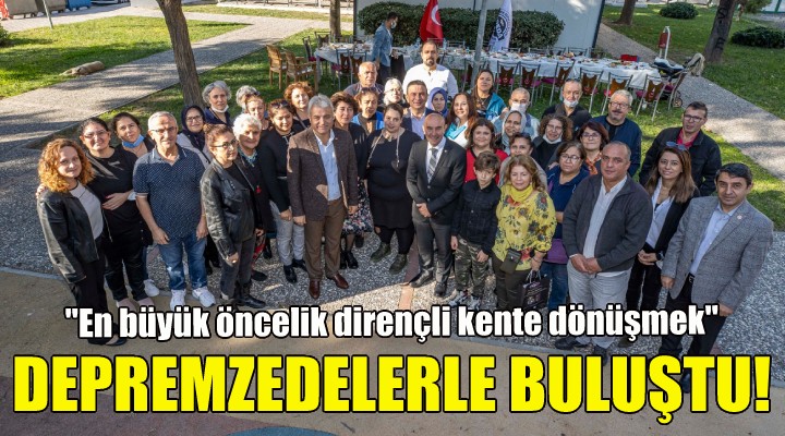 İzmir Büyükşehir Belediye Başkanı Tunç Soyer, 30 Ekim İzmir depreminin yıldönümü öncesi deprem mağdurlarıyla bir araya geldi. Bayraklı Manavkuyu’da düzenlenen buluşmaya İzmir Büyükşehir Belediye Başkanı Tunç Soyer’in eşi Neptün Soyer, İzmir Depremzedeleri Dayanışma Derneği (İZDEDA) Başkanı Haydar Özkan ve eşi Selma Özkan, Türkiye Emekli Astsubaylar Derneği Bayraklı Şube Başkanı Kenan Örük, İZDEDA üyeleri ve Bayraklı bölgesindeki depremzedeler katıldı.