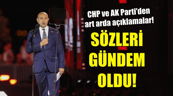 İzmir'de gerçekleştirilen görkemli 9 Eylül kutlamalarına İzmir Büyükşehir Belediye Başkanı Tunç Soyer'in konuşması damga vurdu. CHP ve AK Partili isimlerden art arda açıklamalar geldi.