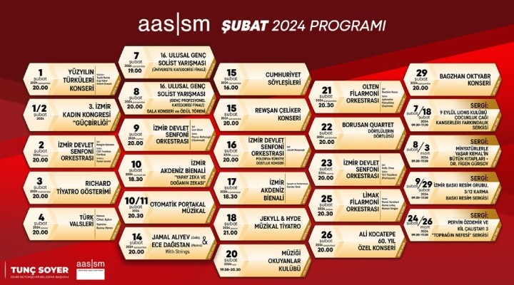 İzmir Devlet Senfoni Orkestrası konserleri, Şubat ayıda da yine her cuma AASSM'de dinleyicileriyle buluşmaya devam edecek. Konser biletleri biletinial.com adresinden satışta olacak. 7 Şubat-18 Şubat tarihleri arasında “9 Eylül Lions Kulübü Çocukluk Çağı Kanserleri Farkındalık Sergisi'' AASSM Alt Galeride, 8 Şubat-3 Mart tarihleri arasında Dr. Figen Gürsoy'un “Minyatürlerle Yaşar Kemal'in Bütün Kitapları Sergisi” AASSM Giriş Galerilerde, 8 Şubat-29 Şubat tarihleri arasında “İzmir Baskı Resim Grubu 3/12 Karma Baskı Resim Sergisi” AASSM Üst Kat Batı Galeride, 24 Şubat-26 Mart tarihleri arasında Pervin Özdemir Kil Çalıştayı ve “Toprağın Nefesi Sergisi'' AASSM Alt Galerilerde ücretsiz olarak gezilebilecek. AASSM'de Şubat ayında düzenlenecek tüm etkinliklerin ayrıntılarına ''aassm.org.tr'' adresinden ulaşılabilir.