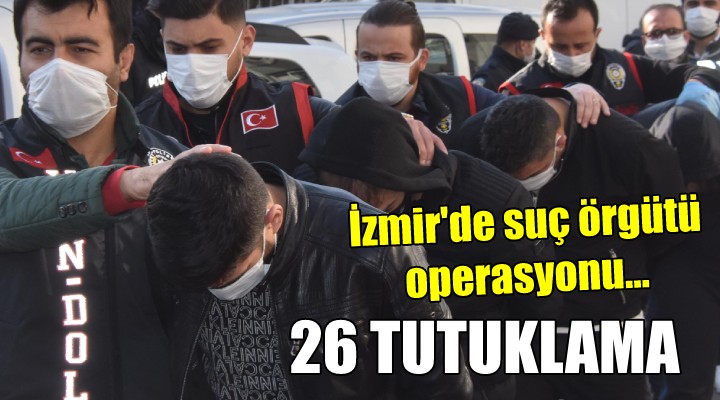 İzmir Cumhuriyet Başsavcılığınca, "suç örgütü kurma ve yönetme", "nitelikli dolandırıcılık" ve "suç gelirlerini aklama" suçlarına ilişkin soruşturma kapsamında 2 Aralık'ta düzenlenen eş zamanlı operasyonda yakalanan ve dün emniyetteki işlemlerinin ardından adliyeye sevk edilen şüphelilerden 26'sı tutuklandı.