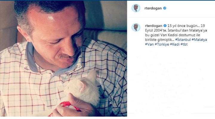 Erdoğan, Instagram hesabı üzerinden, 2004'te İstanbul'dan Malatya'ya seyahati sırasında kucağında Van kedisi ile çekilen fotoğrafına yer verdi.