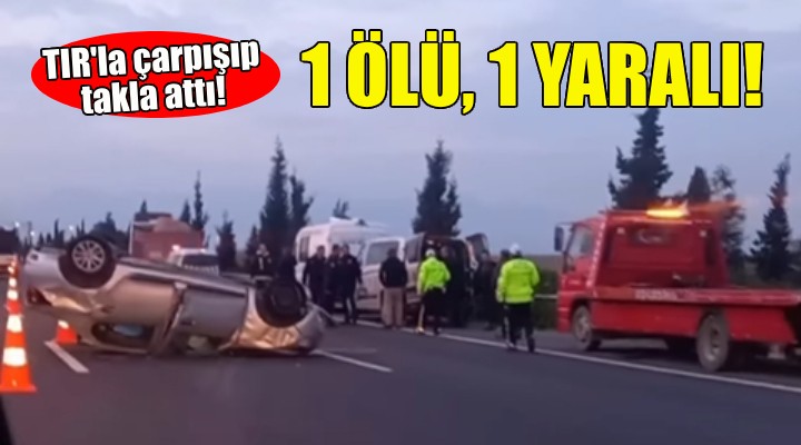 Menemen'den Karşıyaka yönüne giden Emin A. (27) idaresindeki 35 ANL 778 plakalı otomobil, Sasalı mevkisinde aynı istikametteki Selim S'nin kullandığı 35 BS 090 plakalı TIR'la çarpıştı. Çarpmanın etkisiyle savrulan otomobil bariyerlere çarpıp takla attı.