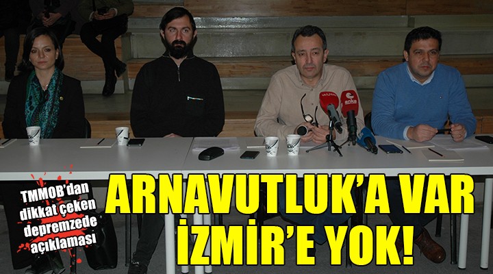 SONKALEİZMİR-Türk Mühendisler ve Mimarlar Odaları Birliği'nin (TMMOB) Alsancak'taki binasında düzenlenen basın açıklamasına TMMOB İzmir İl Koordinasyon Kurulu (İKK) Dönem Sözcüsü Aykut Akdemir, Çevre Mühendisleri Odası İzmir Şube Başkanı Helil İnay Kınay, Şehir Plancıları Odası İzmir Şube yöneticisi Zafer Mutluer, Mimarlar Odası İzmir Şube Başkanı İlker Kahraman ile bazı depremzedeler katıldı.