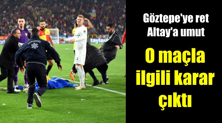 Altay Hukuk Kurulu, Tahkim Kurulu'na itiraz başvurusunda derbide Altay taraftarı Furkan Ersanlı'nın fişek atarak Göztepeli Mehmet Çakır'ı yaraladığı olayın tribünde gerçekleştiğine dikkat çekerken, güvenlik sorumluluğunun kendilerinde olmadığının altını çizmişti.