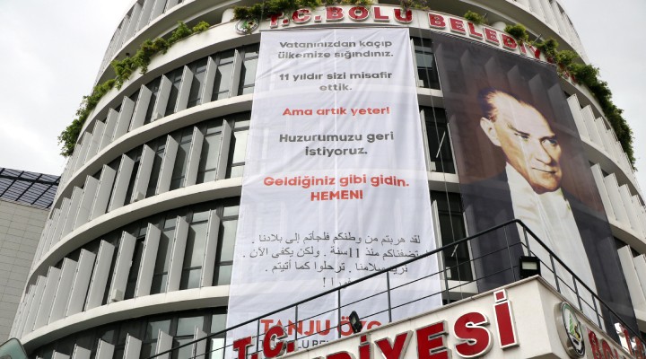 Demokrasi Meydanı’ndaki belediye binasının ön cephesine asılan Türkçe ve Arapça yazılı pankartta, “Vatanınızdan kaçıp ülkemize sığındınız. 11 yıldır sizi misafir ettik ama artık yeter. Huzurumuzu geri istiyoruz. Geldiğiniz gibi gidin hemen” ifadeleri yer aldı.