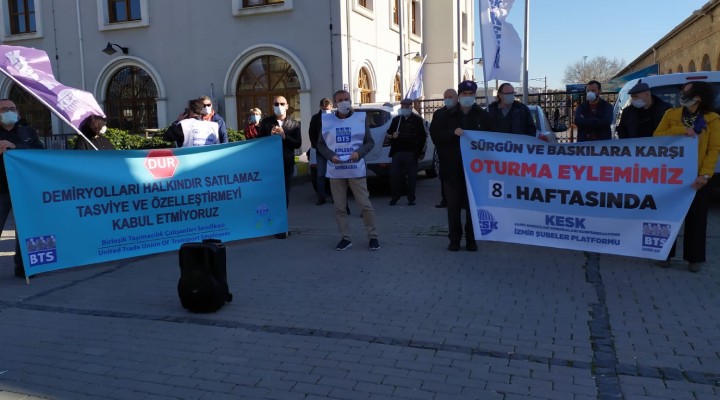 "Baskılar Sürgünler Bizi Yıldırımaz" şeklinde slogan atıp basın açıklaması ve oturma eylemi yapan 20 kişilik grup, sürgün ve baskı iddialarıyla ilgili ise tepkilerini dile getirdi. BTS İzmir Şube Başkanı Erdal Akyol, BTS İzmir Şube Hukuk TİS ve İnsan Hakları Sekreteri Necat Sezginer ile Eski MYK ve Şube Başkanı Bülent Çuhadar da birer konuşma yaptı. BTS İzmir Şube Başkanı Erdal Akyol, çalışanları sürgüne gönderip aile barışını bozanlardan yasal yollarla hesap soracaklarını belirterek, "Bu kara zihniyeti çok yakından tanıyoruz. Demokrasiye temel hak ve özgürlüklere, farklılıklara, muhalefete tahammülsüz bir iktadar ile ve onların kurumlarındaki temsilcileriyle karşı karşıyayız. Bizlere sosyal mesafe cezası kestirenler, halka dükkanlarını kapattırıp hiçbir yardım yapmayan ve ölüme mahkum edenlerler, kendileri lebalep toplantılarla kongreler düzenlemektedir" diye konuştu.