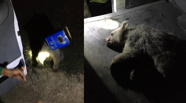 Tendürek Dağı Geçidi'nde devriye gezen jandarma ekibi, başını teneke kutuya sıkıştıran yavru ayıyı gördü.