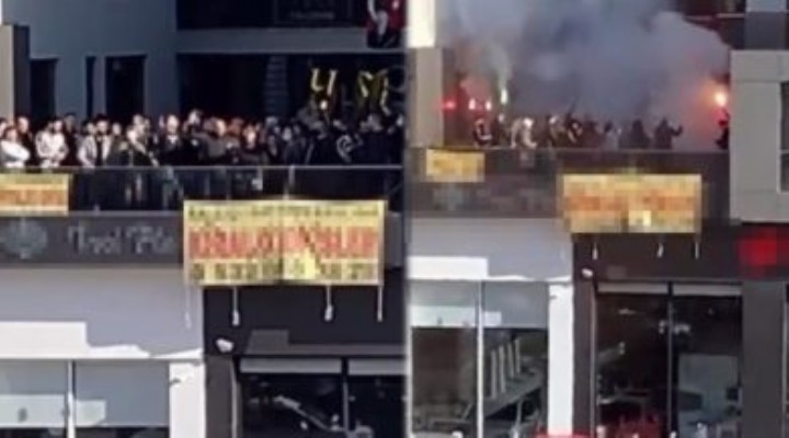 Kızılarık Caddesi’ne de cephesi olan terasa çıkan grup meşaleler yaktı, maske ve sosyal mesafe kurallarını ihlal ederek kutlama yaptı.
