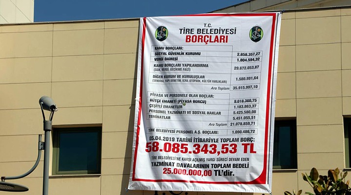 Millet İttifakı'ndan girdiği 31 Mart'taki seçimleri kazanarak göreve gelen İYİ Partili Tire Belediye Başkanı Salih Atakan Duran, devraldığı belediyeye ait borç durumunu gösteren iki dev afiş hazırlattı. Tire Belediyesi'nin 58 milyon 85 bin 343 lira 85 kuruş olan borcunun kalem kalem yazıldığı afiş, Tire Belediyesi Hizmet Binası ve Zabıta Müdürlüğü dış duvarına asılarak Tire halkına duyuruldu. Afişte borcun, Başkan Duran'ın resmen göreve başladığı 5 Nisan 2019 tarihine kadar olan dönemi kapsadığı ve 25 milyon TL'lik yargı süreci devam eden tazminat davalarının dahil olmadığı ifade edildi. Tire Belediye Başkanı Salih Atakan Duran, seçimler öncesi Tireliler'e şeffaf belediyecilik konusunda söz verdiğini belirtip, "Görev sürem boyunca da benim yönetimimdeki belediyeye ait son durumu yine aynı afiş yöntemiyle insanlara duyuracağım. Tire Belediyesi benim döneminde şeffaf ve hesap verilebilir bir hale gelecek" dedi. Önceki dönemde Tire'de CHP'den belediye başkanı olan Tayfur Çiçek, son seçimde DSP'den aday olmuştu. DHA