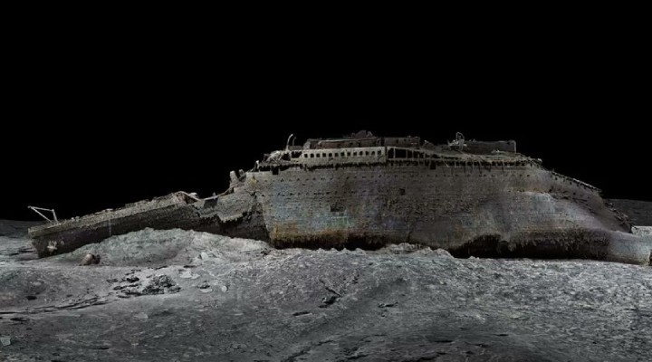 Atlantik Okyanusu'nda 3 bin 800 metre derinlikte bulunan Titanic gemisi enkazının ilk tam boyutlu dijital taraması, derin deniz haritalaması yöntemiyle oluşturuldu.