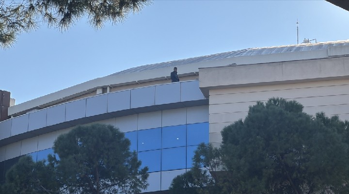 Yol yapım işini üstlenen firmada çalışan bir grup işçi, Torbalı Belediyesi hizmet binasının terasına çıktı.
