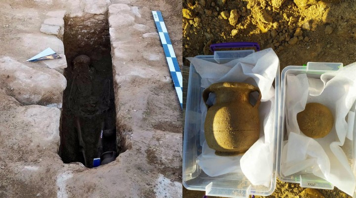 Dün arazide kazı çalışması yapan Manisa Müze Müdürlüğü ekipleri, alanda Helenistik döneme ait olduğu değerlendirilen mezar içinde iskelet, topraktan yapılmış 2 kap ve 4 parça halinde sarı renkli amorf nitelikli obje buldu. Toprak kaplar ve sarı renkli metal objeler Müze Müdürlüğü ekiplerince muhafaza altına alındı. İskelet, kazının sonlanmasının ardından mezara bırakılarak, arazi eski haline getirildi.