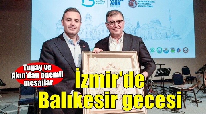 Balıkesir Büyükşehir Belediyesi ve Balıkesirliler Eğitim, Kültür ve Sosyal Dayanışma Derneği, İzmir Tepekule Kongre Merkezi’nde Türkülerle Oyunlarla Balıkesir Gecesi etkinliği düzenledi. Geceye İzmir Büyükşehir Belediye Başkanı Dr. Cemil Tugay ile Balıkesir Büyükşehir Belediye Başkanı Ahmet Akın, AK Parti Balıkesir Milletvekili Dr. Mustafa Canbey, İzmir Vali Yardımcısı İsmail Çorumluoğlu, Bayraklı Belediye Başkanı İrfan Önal, Balıkesir Balya Belediye Başkanı Orhan Gaga, İzmir Büyükşehir Belediyesi Genel Sekreteri Ramazan Tezcan, İzmir Balıkesirliler Eğitim Kültür ve Sosyal Dayanışma Derneği Yönetim Kurulu Başkanı Erkan Uzun, meclis üyeleri, muhtarlar, sivil toplum kuruluşlarının temsilcileri ve vatandaşlar katıldı. Balıkesir Büyükşehir Belediye Başkanı Ahmet Akın, Başkan Dr. Cemil Tugay’a hediye takdim etti. Gece yöresel oyunlar ve türkülerle devam etti.