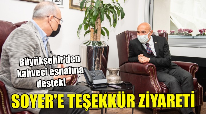izmir Büyükşehir Belediye Başkanı Tunç Soyer, İzmir Kahveciler Esnaf Odası Başkanı İsmail Hakkı Kırdı'yı makamında ağırladı. Büyükşehir Belediyesi'nin esnafa yaptığı desteğe teşekkür amacıyla düzenlenen ziyarete İzmir Büyükşehir Belediyesi Genel Sekreteri Dr. Buğra Gökçe, İzmir Büyükşehir Belediyesi Genel Sekreter Yardımcısı Ertuğrul Tugay, İzmir Büyükşehir Belediyesi Sosyal Hizmetler Daire Başkanı Ulaş Aydın ve İzmir Kahveciler Esnaf Odası yönetimi de katıldı.