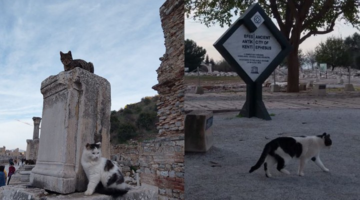 SONKALEİZMİR-İzmir'in Selçuk ilçesinde bulunan Efes Antik Kenti'nde azalan turist grupları, yerini kedilere bıraktı. Antik dönemin en önemli kültür, sanat ve bilim merkezi olan Efes Antik Kenti'ni görmek için dünyanın dört bir yanından gelen turistler, aynı zamanda kedilere de büyük ilgi gösteriyor. Efes'in hemen hemen her noktasında görülen sevimli dostlarla bol bol fotoğraf çektiren turistler, tarihi bir gezinin ardından yüzlerindeki gülümseme ile ayrılıyor.