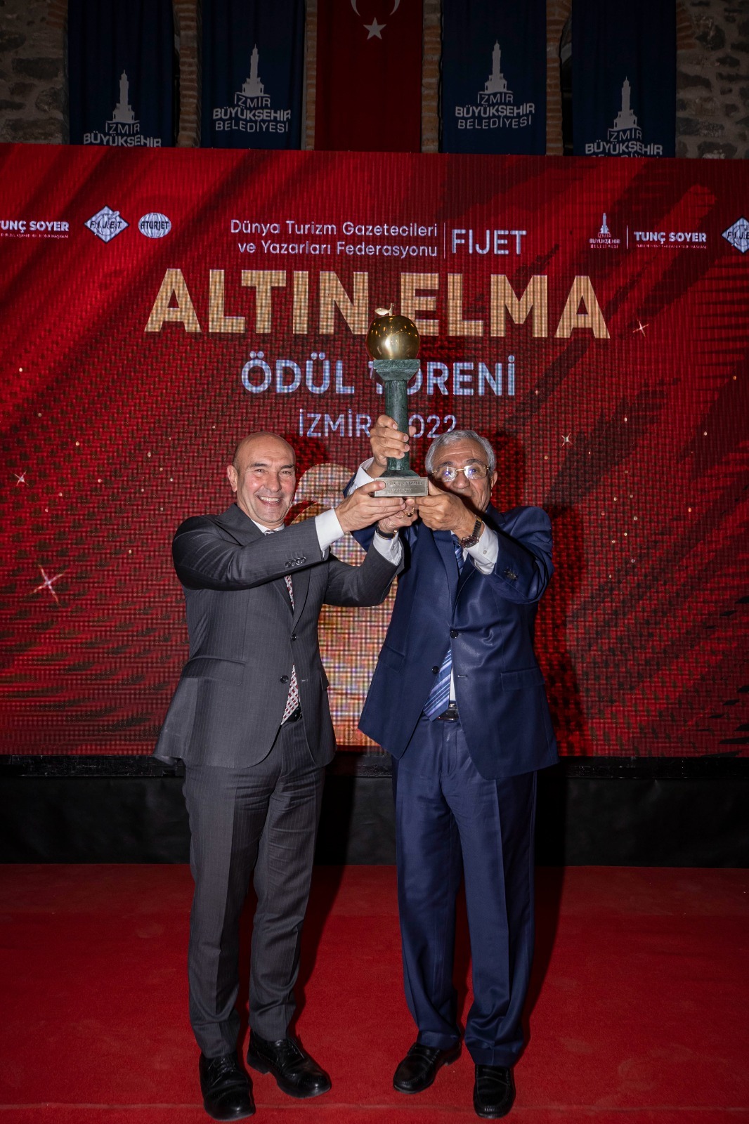 Uluslararası Turizm Gazetecileri ve Yazarları Federasyonu (FİJET), “Dünya Turizm Oscar”ı olarak anılan “Altın Elma Ödülü”nü bu yıl kentin tarihi ve kültürel değerlerini koruyarak turizm faaliyetlerini destekleyen İzmir Büyükşehir Belediyesi’ne verdi. İzmir Büyükşehir Belediye Başkanı Tunç Soyer, ödülü Dünya Turizm Gazetecileri ve Yazarları Federasyonu Başkanı Tijani Haddad'ın elinden aldı.