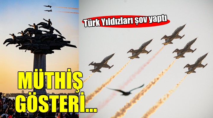 İzmir’de gün boyu süren 29 Ekim Cumhuriyet Bayramı kutlamaları, Türk Hava Kuvvetleri’nin gururu Türk Yıldızları’nın gösterisiyle devam etti. Gündoğdu Meydanı’nda toplanan binlerce İzmirli, yurt içinde 500’üncü gösterisini yapan Türk Yıldızları’nı heyecanla takip etti. 5 uçakla gösteri yapan Türk Yıldızları, Cumhuriyet coşkusunu zirveye çıkardı. Yurttaşlar, hem meydandan hem de evlerinden bayraklar ve marşlarla gösteriye eşlik etti.